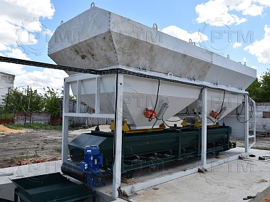 1. Дозирующий комплекс СТ-40 (2 секции по 20 м3): состоит из двух до четырех бункеров для хранения инертных материалов (щебень, песок, отсев). На каждом бункере имеется два пневмо- затвора, необходимых для точной дозации материалов. При дозировании материалы попадают на весовой ленточный конвейер, весовые датчики фирмы CAS Ю.Корея, при наборе нужного количества материалов, заслонки закрываются, подача прекращается. Объем каждого бункера от 2,5 м3 до 20 м3, в зависимости от комплектации завода. Каждый бункер оснащен вибродвигателем MVE 300/3.