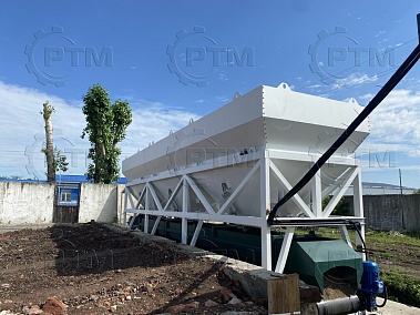 1. Дозирующий комплекс СТ-40 (2 секции по 20 м3): состоит из двух до четырех бункеров для хранения инертных материалов (щебень, песок, отсев). На каждом бункере имеется два пневмо- затвора, необходимых для точной дозации материалов. При дозировании материалы попадают на весовой ленточный конвейер, весовые датчики фирмы CAS Ю.Корея, при наборе нужного количества материалов, заслонки закрываются, подача прекращается. Объем каждого бункера от 2,5 м3 до 20 м3, в зависимости от комплектации завода. Каждый бункер оснащен вибродвигателем MVE 300/3.