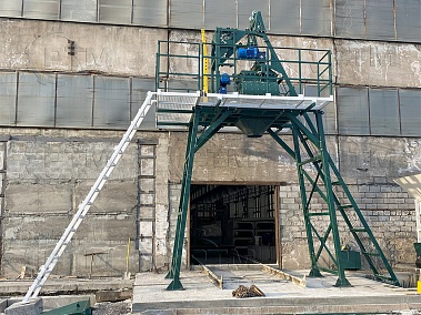 2. После набора нужного количества материалов инертные попадают в скиповый бак, далее скиповый бак поднимается и высыпает материалы в бетоносмеситель.